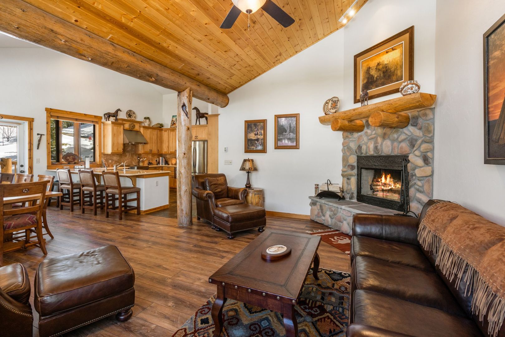 The open-concept great room on the main level is perfect for entertaining, featuring soaring cathedral ceilings and direct access to a spacious outdoor deck. The lower-level bonus room serves as a second living area, complete with a sleeper sofa and ample space for larger groups, along with plentiful storage.